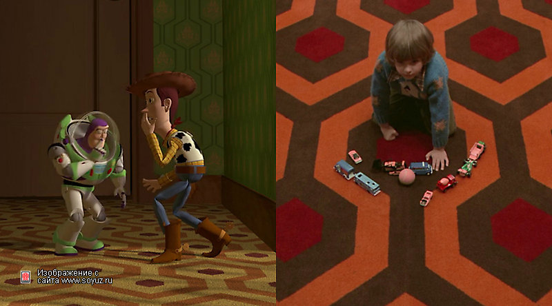 Также аниматоры Disney любят лишний раз выразить свое почтение мастеру саспенса Стенли Кубрику. В качестве «нашего вам с кисточкой» используется ковер из «Сияния», паттерн с которого так и норовит появиться то в качестве обоев, то в качестве рисунка на платье и т.д.