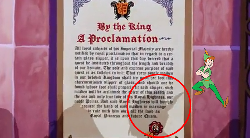 В конце 1949 года Уолт Дисней работал сразу над двумя мультфильмами: «Золушкой» и «Питером Пэном». Однако работа над вторым стопорилась, и решено было отложить его, выпустив вперед мультфильм о девушке, обронившей на балу хрустальную туфельку. Чтобы намекнуть зрителям, что скоро Питер Пэн, так или иначе, полетит в Нетландию, аниматоры Disney «пригласили» его в «Золушку» - чтобы прочитать королевский указ.