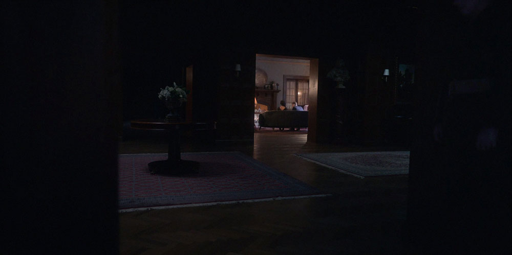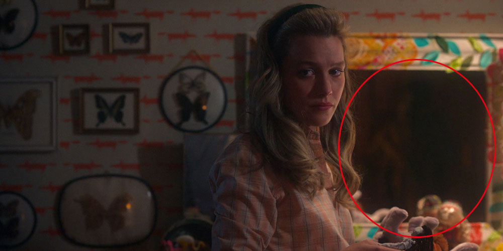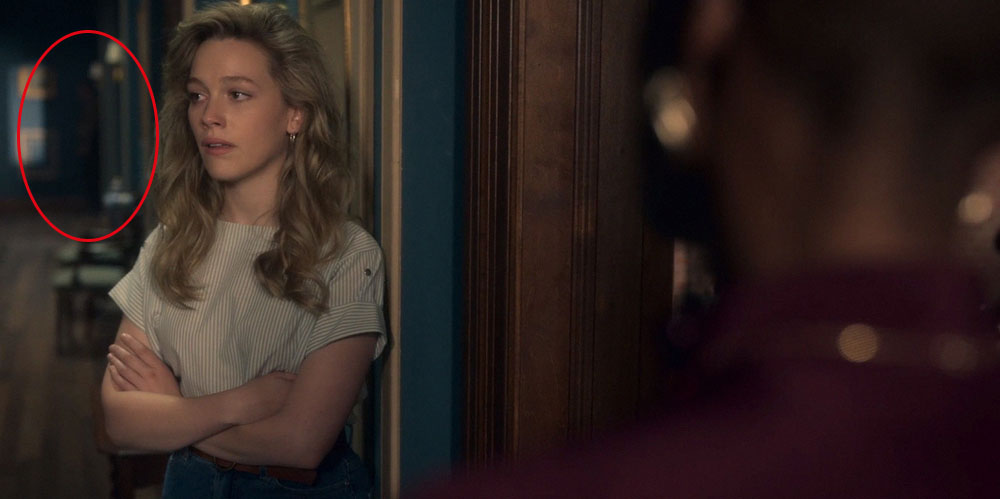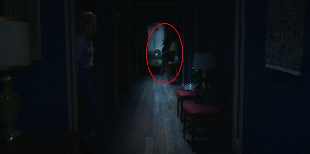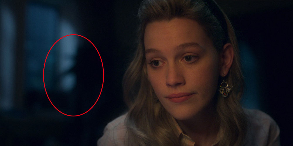 Пока Ханна и Дэни находятся в комнате Флоры, в дверном проеме ванной комнаты кто-то стоит (00:23:40). Выглядит устрашающе.