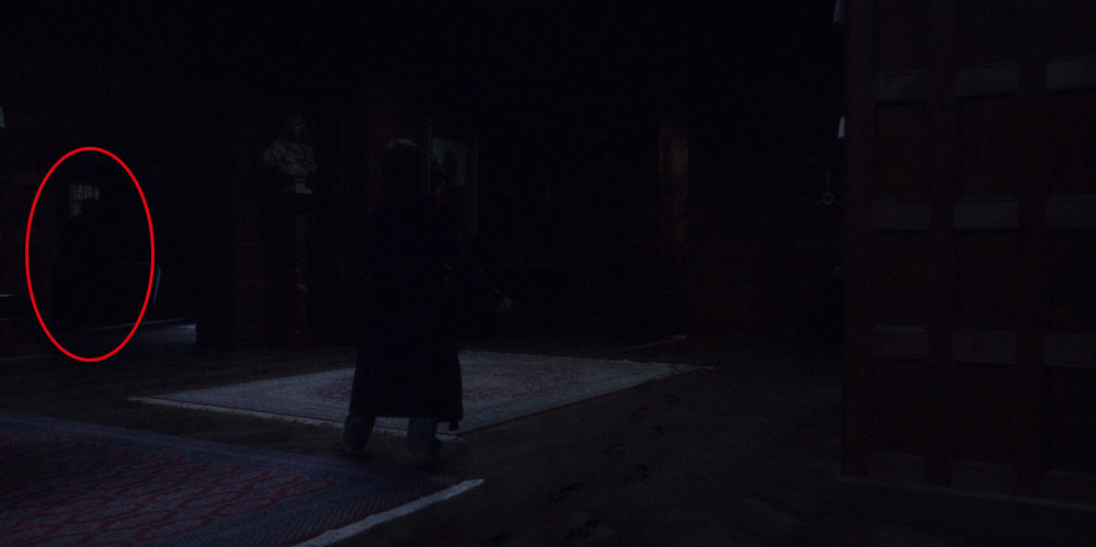 Солдат вернулся вновь – на этот раз его уж очень хорошо видно. Прямо за Ханной Гроуз (Т’Ниа Миллер) на отметке 00:07:17, когда героиня убеждает полицейского сделать еще один обход в поисках Питера. В то же время на улице полицейского поджидал Мальчик с лицом куклы (00:07:32), который все же быстро забежал внутрь и затаился за стеной у бюста (00:07:58).