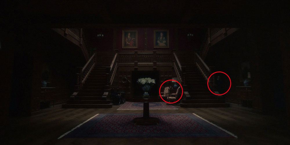 В первом же эпизоде на 00:20:56 и 00:20:59 можно встретить сразу двух призраков. Герои под чутким руководством Флоры Уингрейв (Амели Смит) так спешили подняться на второй этаж, что даже не заметили, что у лестницы затаились еще два обитателя дома. Можно было бы хоть поздороваться.
