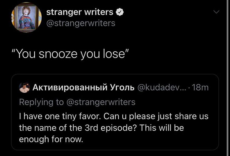 Мы уже говорили, что в новом сезоне будут каким-то образом задействованы путешествия во времени – то ли через специальное устройство перемещения, то ли за счет своеобразного течения времени на стороне Изнанки. В свое время авторы сериала, решив пошутить, обнародовали названия двух серий – «Tick Tock Mr Clock» и «You Snooze You Lose». Хотя их истинность сомнительна, они могут быть еще одной подсказкой для фанов. «Фактор времени» – отличный двигатель сюжета, и что, если время будет «подхлестывать» героев одновременно и в Изнанке, и в другом времени, и в реальном 1986-м, как это было, например, в фильме «Люди Икс: Дни минувшего будущего»? Таким образом любимое Дафферами «параллельное действие» будет развиваться не только в разных пространствах, как это было доселе, но и в других временах.