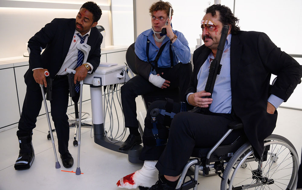 Собственно, даже такого упрощенного экшена в «Коктейле» приходится ждать по полчаса. Большую часть хронометража занимают беседы, написанные как бы в постмодернистском ключе, но без единой смешной шутки: