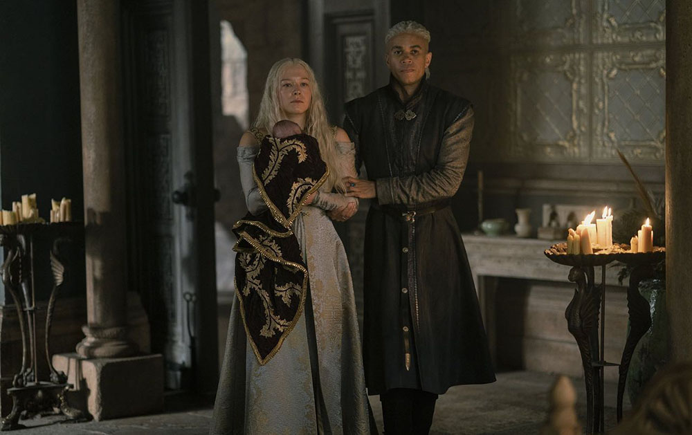 В 6 серии на свет появляется третий сын Рейниры – Джоффри. Как только это происходит, Рейнире сообщают, что королева Алисента зачем-то хочет взглянуть на новорожденного. Алисента может быть сколько угодно деспотичной, но на самом деле ее интерес, судя по всему, разделяют многие при дворе. То, что все дети Рейниры удивительно похожи на сира Харвина Стронга, капитана Золотых плащей, а вовсе не на мужа Рейниры Лейнора, попросту бросается в глаза.