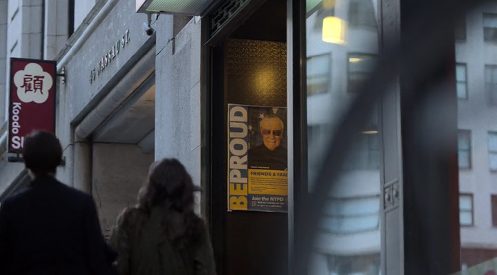 Естественно, это бы не был проект Marvel без камео великого Стэна Ли. В последнее время он часто болеет, да и возраст уже не позволяет участвовать в долгих съемочных процессах, поэтому сцены с ним для фильмов записывают задолго до того, как приступят к основным съемкам (например, сцена Стена Ли в «Логане», анонсирующая «Дэдпул 2», была записана во время съемок первых «Стражей Галактики»), но все же вы можете заметить в последней серии постер, на котором Стэн Ли запечатлен в образе полицейского.