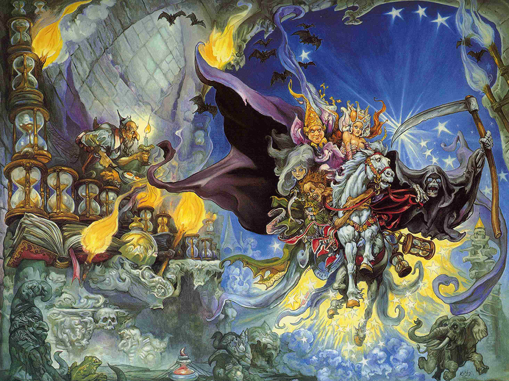 Успех первых романов подвиг будущего сэра Терри на продолжение серии. Однако если средний писатель так и множил бы незадачливых волшебников, то Пратчетт решил взглянуть на проблему как бы с другой стороны, поставив в центр повествования ведьм. Как и в случае с «Цветом волшебства», первая книга так называемого «ведьминского цикла» под названием «Творцы заклинаний» стала введением в новый мир и знакомством с его обитателями. Именно здесь впервые появляется главная героиня цикла – матушка Ветровоск, и проявляется фирменный юмор, одним из «проводников» которого становится… смерть. Точнее, даже так: СМЕРТЬ, в русском переводе изъясняющийся (в Плоском мире это именно «он») БОЛЬШИМИ БУКВАМИ. А начинается история с того, что волшебник по имени Драм Биллет, отходящий в мир иной, должен передать свой дар некоему восьмому сыну восьмого сына. Дар-то он передает, только вот этот сын оказывается… девочкой.