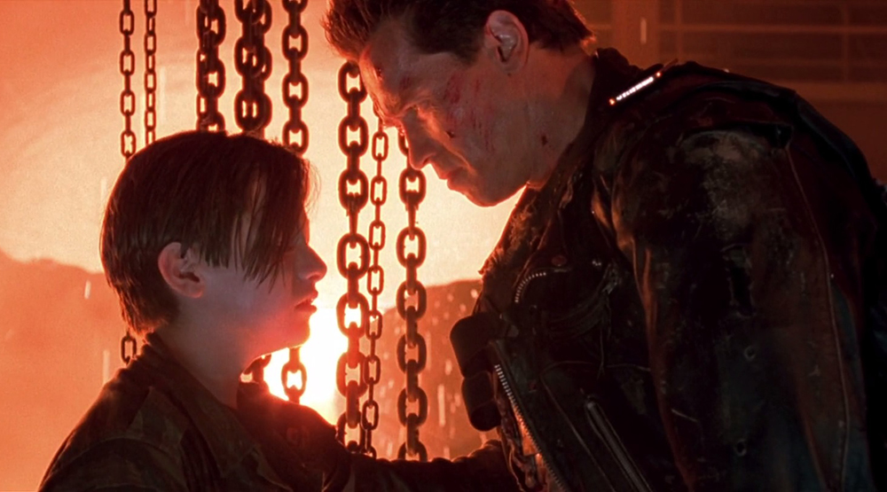 Худо-бедно ребенок перевоспитывает терпеливого Терминатора. Робот становится для Джона не только игрушкой и приятелем, а отцом, которого у мальчика никогда не было. Ожидающая смерти Сара видит, что ее сын подружился с Терминатором – образом, казалось бы, совершенного зла. И внезапно мировоззрение матери меняется: «Он никогда не покинет его, никогда не сделает ему больно, никогда не закричит на него, не напьется, не ударит его. И он умрет, чтобы защитить его». Сара, превращающаяся из боевика-параноика в «мать всего будущего», видит в Терминаторе идеал защитника. Дело еще в том, что и Терминатор перевоспитывает Джона, убеждая, что тот ответственен за будущее человечества. Приходит понимание, что ценность жизни не в легких деньгах и игровых автоматах, а в спасении жизней. Мальчик впервые сталкивается с обязательством.