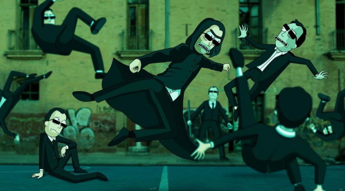 Так, на официальной странице «Рика и Морти» в Twitter опубликовали арт с новой версией культовой экшен-сцены из «Матрицы: Перезагрузка», в которой Нео (Киану Ривз) сражается с двойниками агента Смита (Хьюго Уивинг). Во вселенной «Рика и Морти» с агентами Смитами столкнулся Рик Санчез, который внешне напоминает Нео из «Матрицы: Воскрешение». Агенты Смиты при этом похожи на Джерри Смита, что логично.