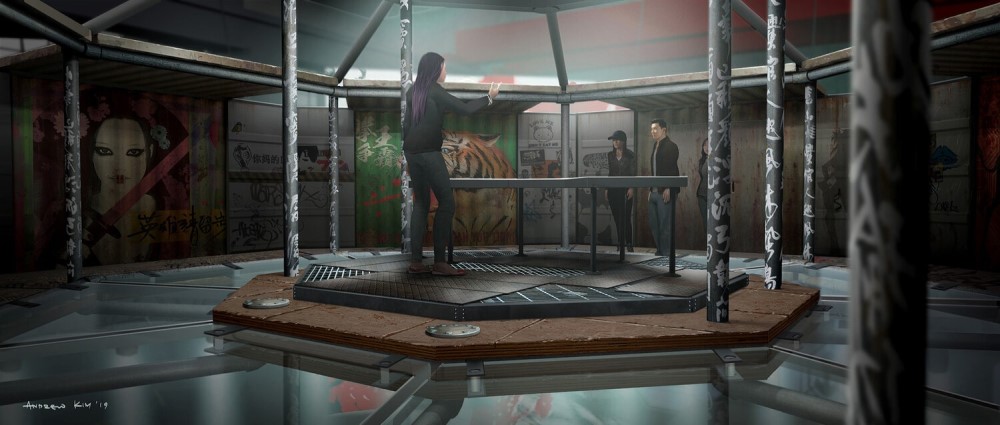 Изображением поделился у себя на сайте художник концепт-артов Эндрю Ким. На фото можно увидеть, что Дэдпул мог выступить одним из участников поединков в бойцовском клубе Сялин (Мэнъэр Чжан) – сестры Шан-Чи (Симу Лю). Уэйд Уилсон столкнулся бы на арене с Проксимой Полночной из команды Таноса – злодейку мы видели в фильмах «Мстители: Война бесконечности» и «Мстители: Финал».