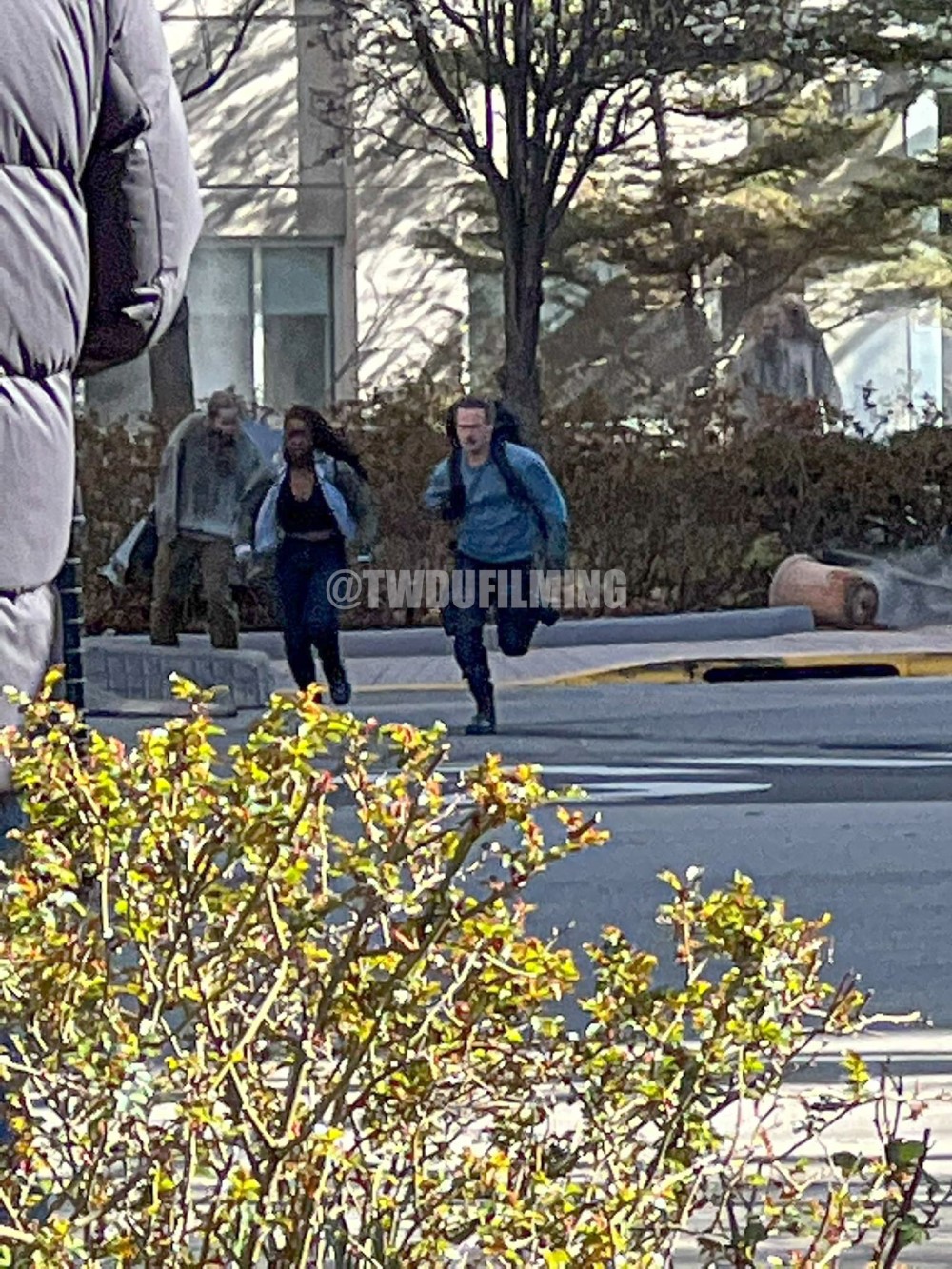 Свежие фото появились на просторах Twitter. На них Рик и Мишонн куда-то стремительно бегут, а их преследует группа ходячих. На Рике можно заметить рюкзак – возможно, такой же есть и у Мишонн, просто его не видно.